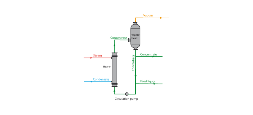 The liquid film moves down the tubes by gravity force. Heat applied through the tube wall effects boiling-off the light fraction from the film. The picture shows a co-current operating evaporator with vapour and liquid leaving the bottom of the evaporator into the separator vessel.
